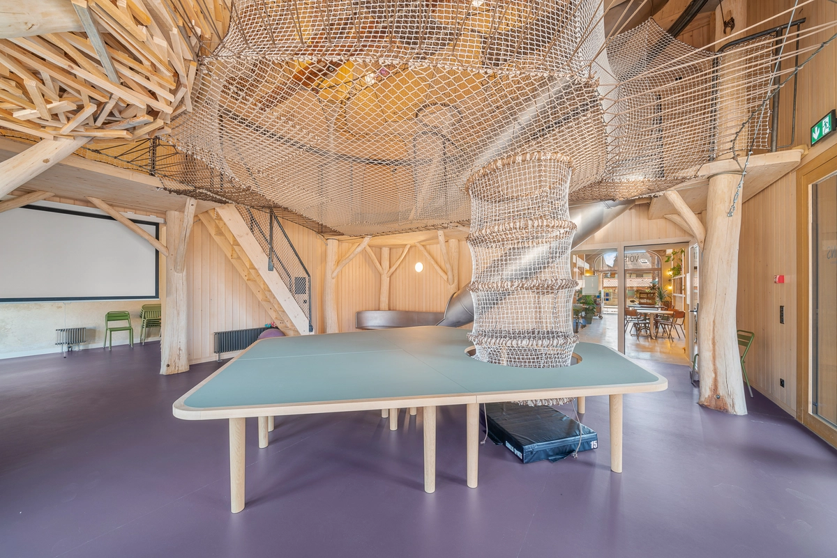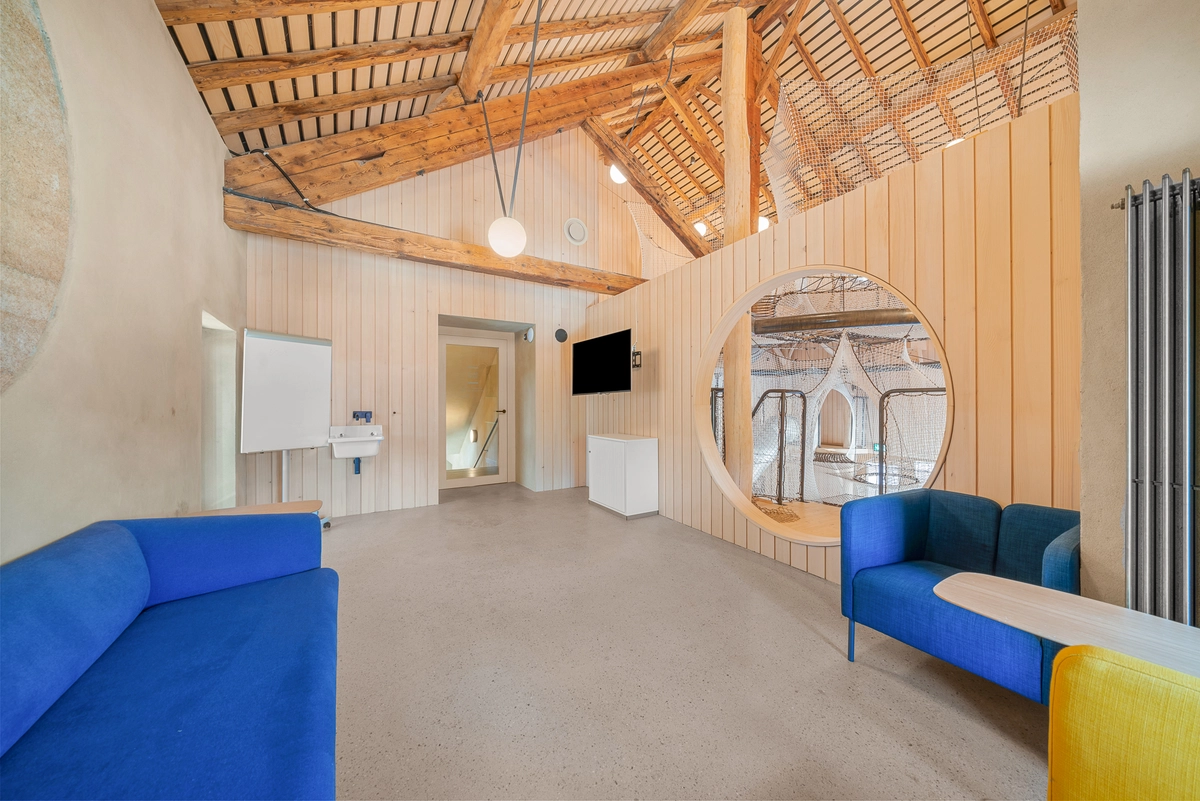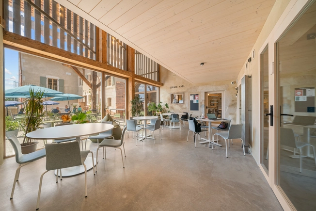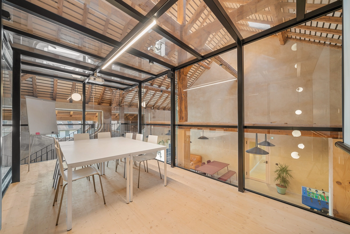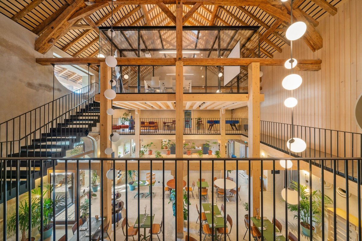 Converted into a coworking space with several offices, meeting rooms, and phone booths. It also features a large restaurant.